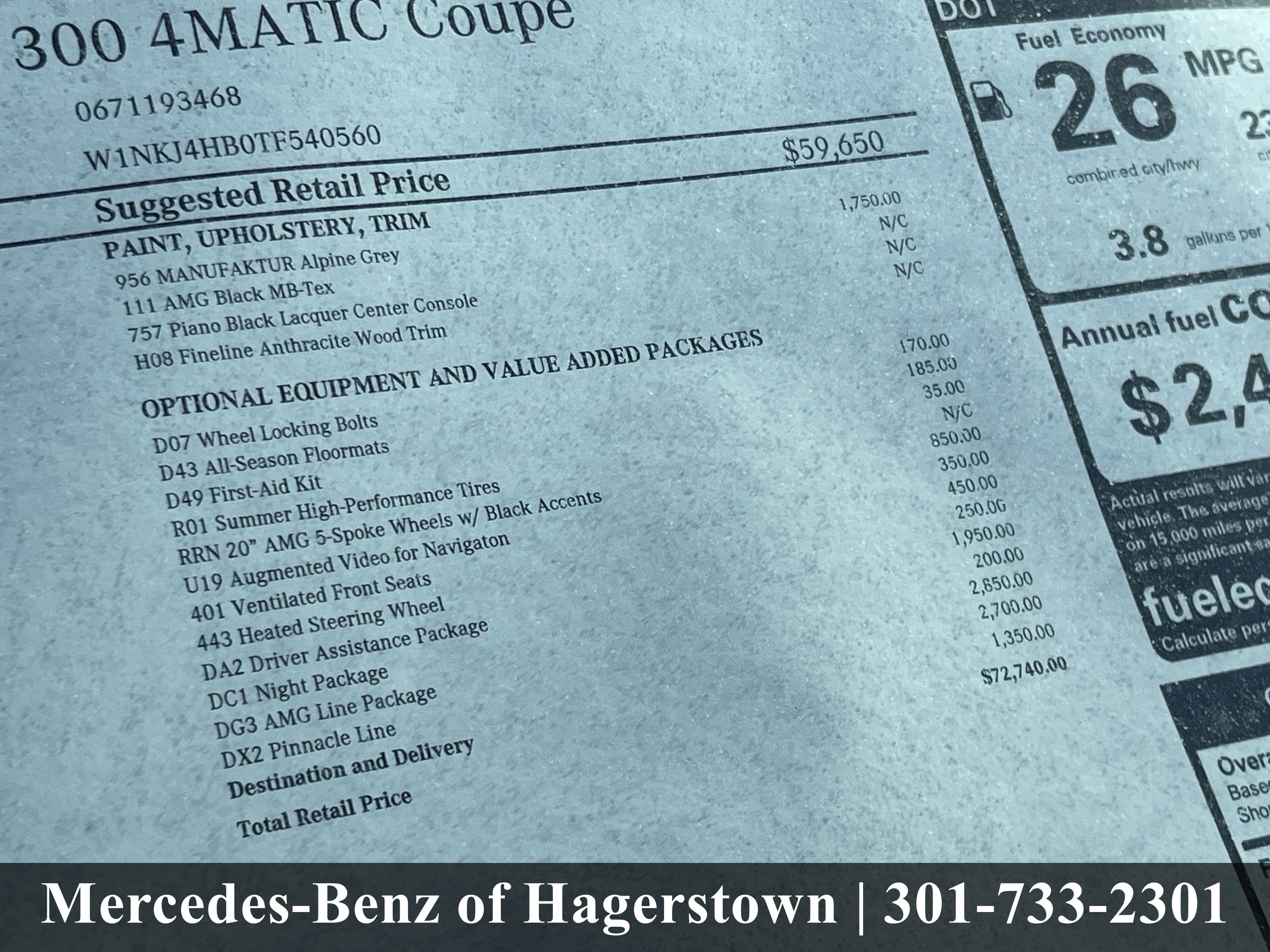 NIGHT PACKAGE -inc: High-Gloss Black Elements, high-gloss on front wing, grille lamellas, rear diffuser insert, exterior mirrors, beltline and window trim, DRIVER ASSISTANCE PACKAGE -inc: route-based speed adaptation, PRE-SAFE PLUS, Active Lane Change Assist, DISTRONIC PLUS w/Steering & Stop & Go Assist, PRE-SAFE Brake w/Pedestrian Recognition, BAS PLUS w/Cross-Traffic Assist, Active Speed Limit Assist, PRE-SAFE Impulse Side, Automatic Lane Change, Driver Assistance Package Plus , PINNACLE TRIM -inc: MBUX Entertainment Plus, Head-Up Display, Heat & Noise Insulating Glass, DIGITAL LIGHT w/Projections, Burmester 3D Surround Sound System, 15 high-performance speakers, DSP amplifier w/a total output of 710 watts (2 x 120 watts, 7 x 50 watts, 6 x 20 watts), 2 broadband speakers in the front area, frontbass technology w/subwoofers, sound optimisation for the front and 2 sound presets, Sound Personalization, PIANO BLACK LACQUER CENTER CONSOLE, MANUFAKTUR ALPINE GREY, FIRST AID KIT, FINELINE ANTHRACITE WOOD TRIM, BLACK RUBBER 4-PACK ALL-SEASON FLOORMATS, BLACK FABRIC HEADLINER, AMG LINE -inc: AMG Line Body Styling, AMG Line Interior, AMG Line Floor Mats, Flat-Bottom Multifunction Sport Steering Wheel, Perforated Brake Discs, Mercedes-Benz lettered calipers, AMG Line Exterior.