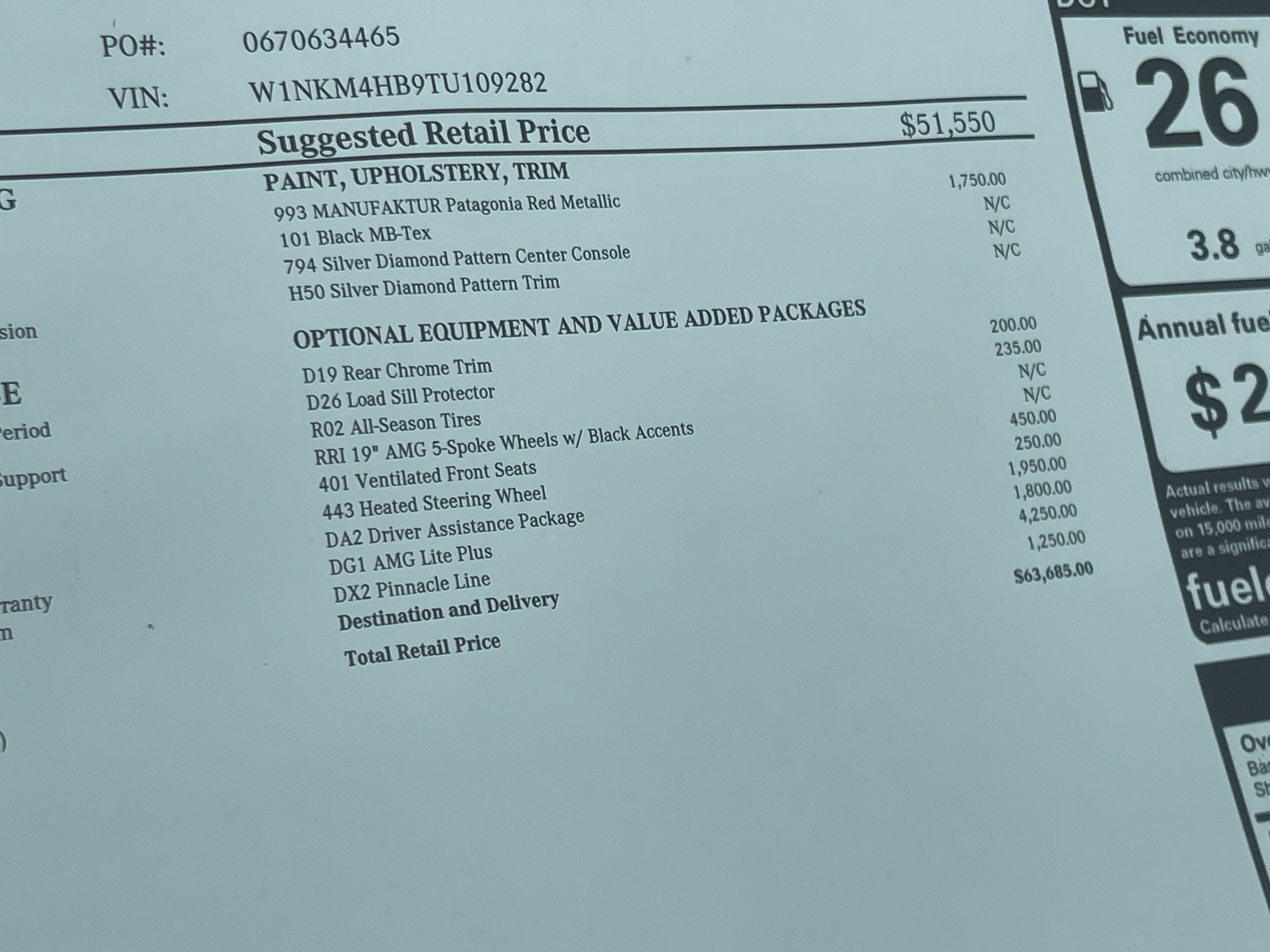 DRIVER ASSISTANCE PACKAGE -inc: route-based speed adaptation, PRE-SAFE PLUS, Active Lane Change Assist, DISTRONIC PLUS w/Steering Assist, stop and go assist, PRE-SAFE Brake w/Pedestrian Recognition, BAS PLUS w/Cross-Traffic Assist, Active Speed Limit Assist, PRE-SAFE Impulse Side, Automatic Lane Change, Driver Assistance Package Plus , SILVER DIAMOND PATTERN TRIM, SILVER DIAMOND PATTERN CENTER CONSOLE, REAR CHROME TRIM, PINNACLE TRIM -inc: MBUX Entertainment Plus, Surround View System, Enhanced Ambient Lighting, MB Navigation, Heat & Noise Insulating Glass, Head-Up Display, DIGITAL LIGHT w/Projections, Burmester 3D Surround Sound System, 15 high-performance speakers, Sound Personalization, Illuminated Door Sills, GUARD 360, picture taking functionality, Augmented Video for Navigation, MANUFAKTUR PATAGONIA RED METALLIC, LOAD SILL GUARD, BLACK UPHOLSTERY, BLACK FABRIC HEADLINER, AMG LITE PLUS -inc: Body Color Roof Spoiler, Panorama Sunroof.